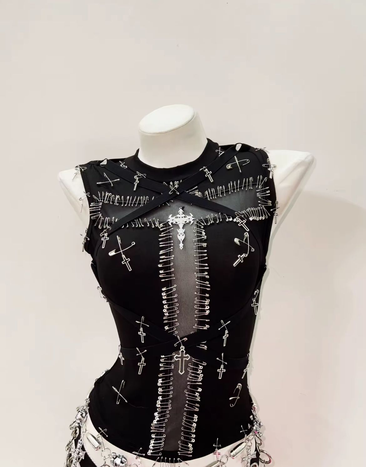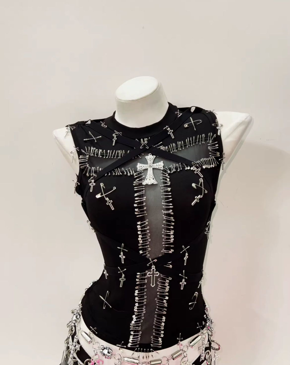 This meticulously crafted Pinned Soul Tank embodies rebellious aesthetics through its strategic embellishments. The sleeveless black silhouette features hand-applied silver safety pins, layered crosses, and a central mesh strip—creating a sophisticated visual tension. The stretch-fit construction ensures optimal comfort while maintaining its edgy profile. For maximum impact, style with heavy chains, tactical cargos, or a dark mini. Each piece represents premium alternative fashion with deliberate attention to detail and proportions.