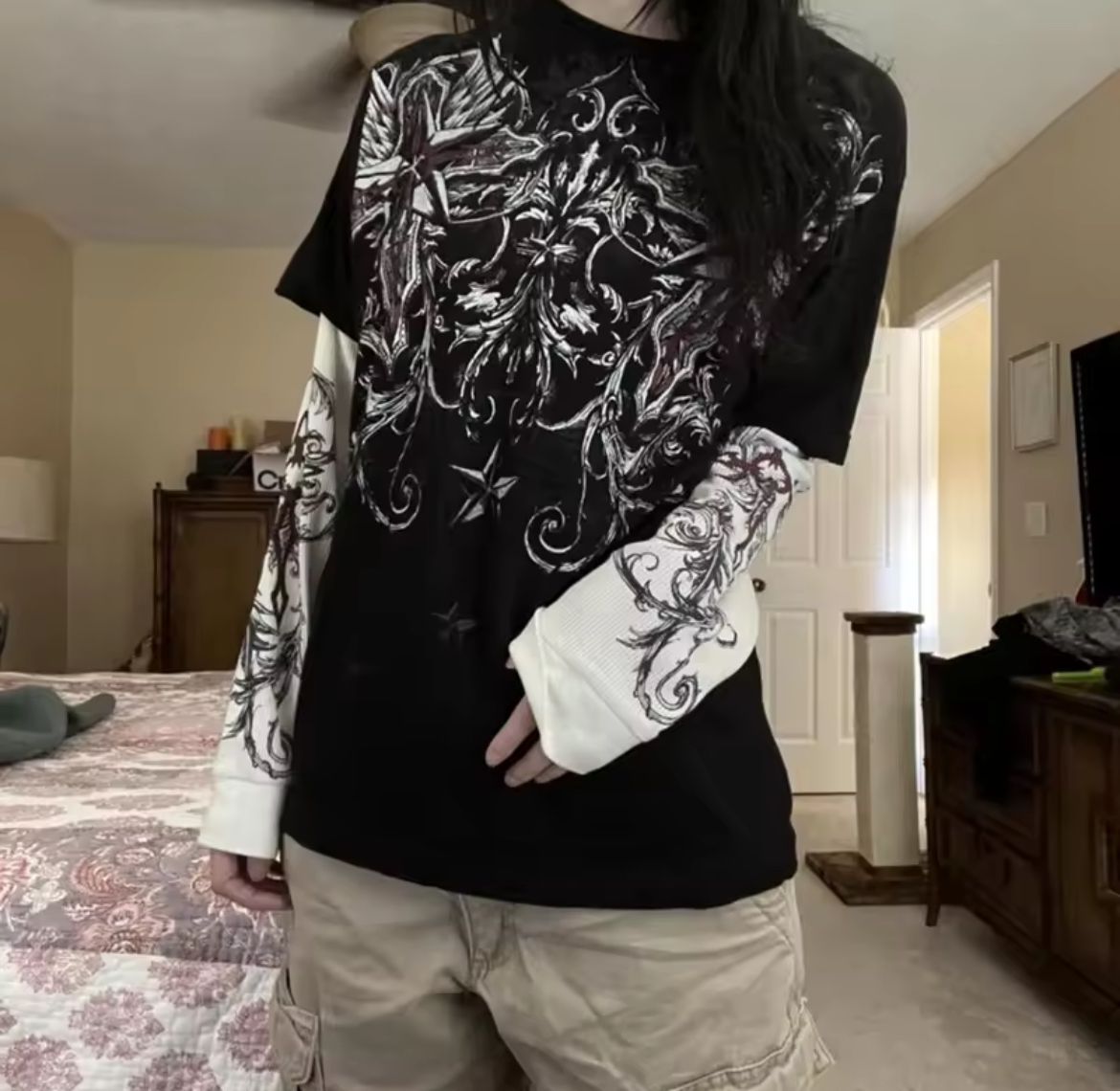 The Royal Ruin Tee features a breathable fabric construction with long sleeves, designed for optimal comfort during extended wear. The specialized material composition facilitates effective air circulation, reducing heat buildup and moisture accumulation. This technical design makes it suitable for various environmental conditions while maintaining its structural integrity throughout repeated use.