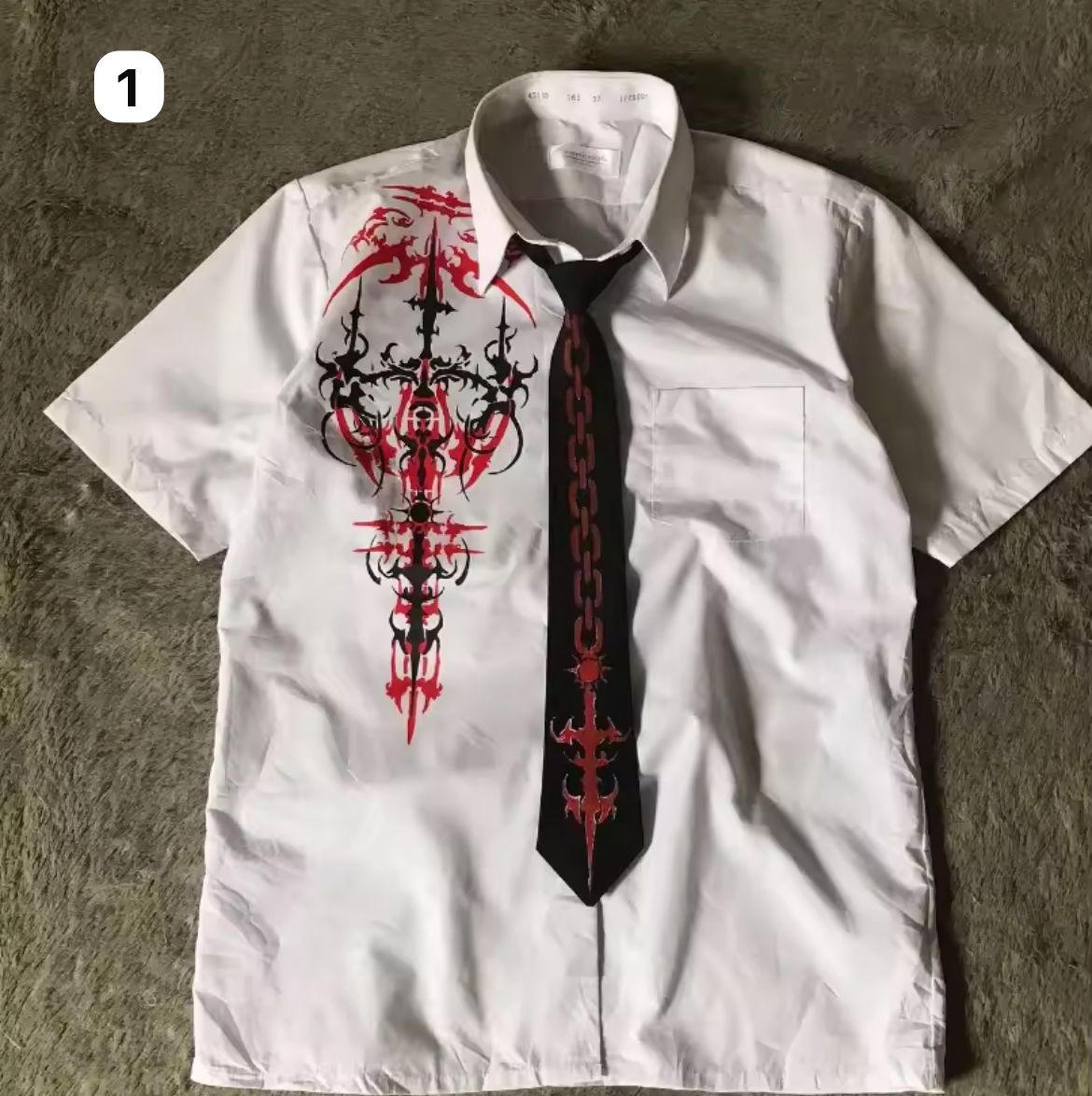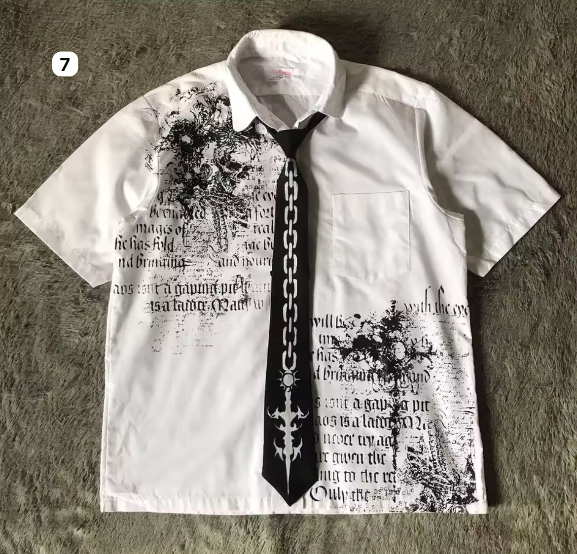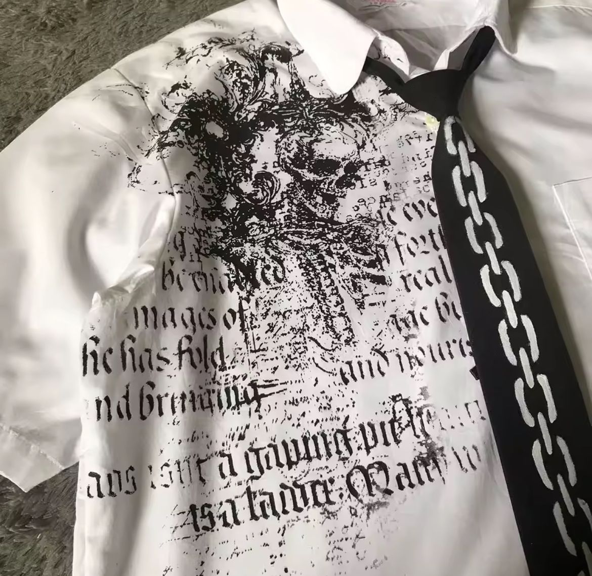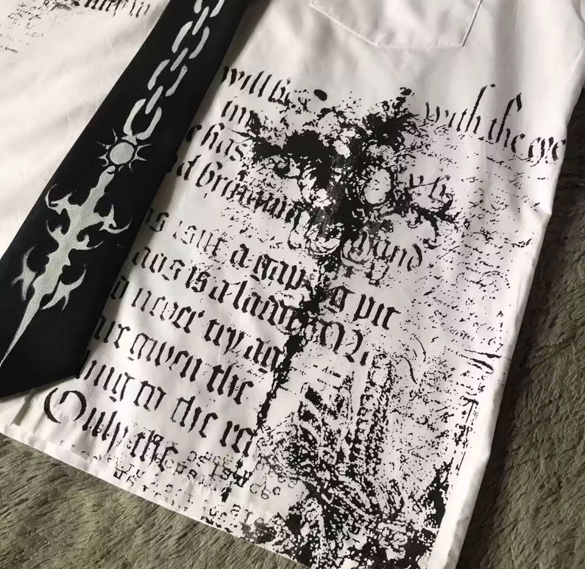 Step into the season with our Limited Edition Gothic Shirt Series — where rebellion meets ritual. Each short-sleeve white shirt is a canvas of chaos: raw graphics, gothic scripture, tribal sigils, and vintage illustrations fused with underground energy. From blood-red symmetries to bone-black emblems and chain-printed ties, these pieces blur the line between dress shirt and statement armor.
