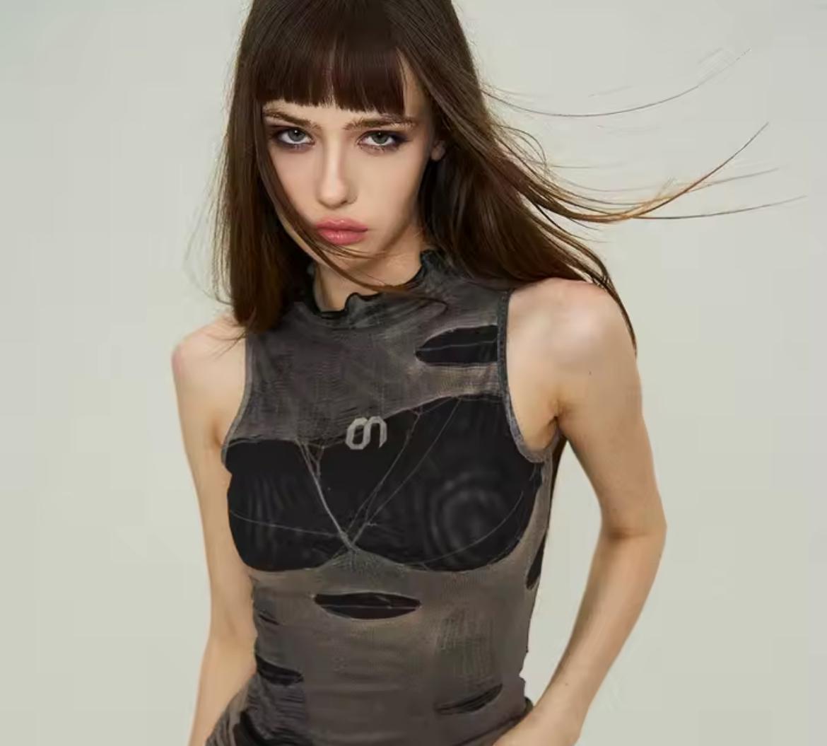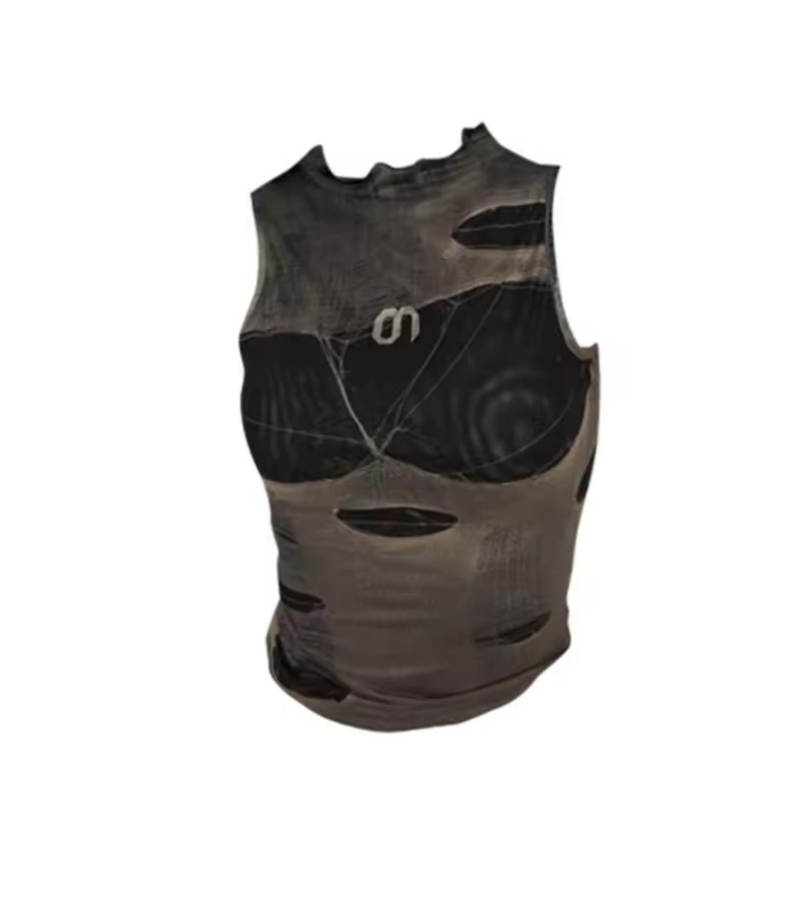 A bold deconstruction of traditional streetwear, this distressed sleeveless mesh top redefines grunge rebellion with a futuristic edge. Torn slashes expose the layered undergarment beneath, creating a raw, undone texture that feels both chaotic and calculated. Subtle web-like stitching overlays the fabric, forming intricate, almost digital patterns, while a small abstract emblem marks the chest, blending street chaos with cyberpunk minimalism. Perfect for pairing with oversized cargos, chunky boots, and heavy metal accessories, this piece radiates untamed energy, daring individuality, and underground street style evolution.