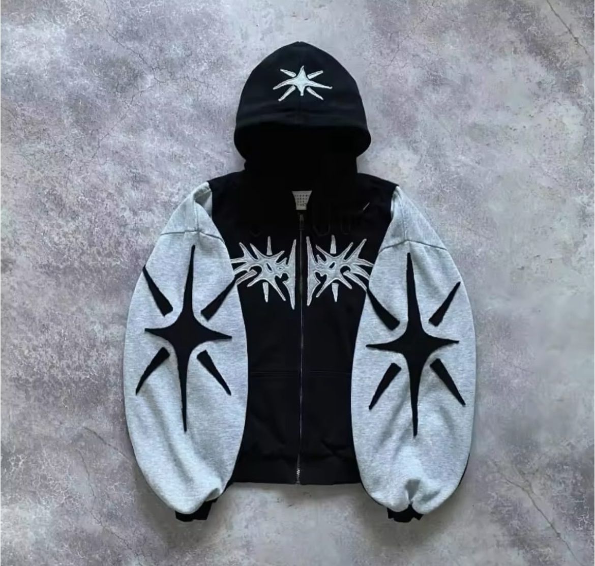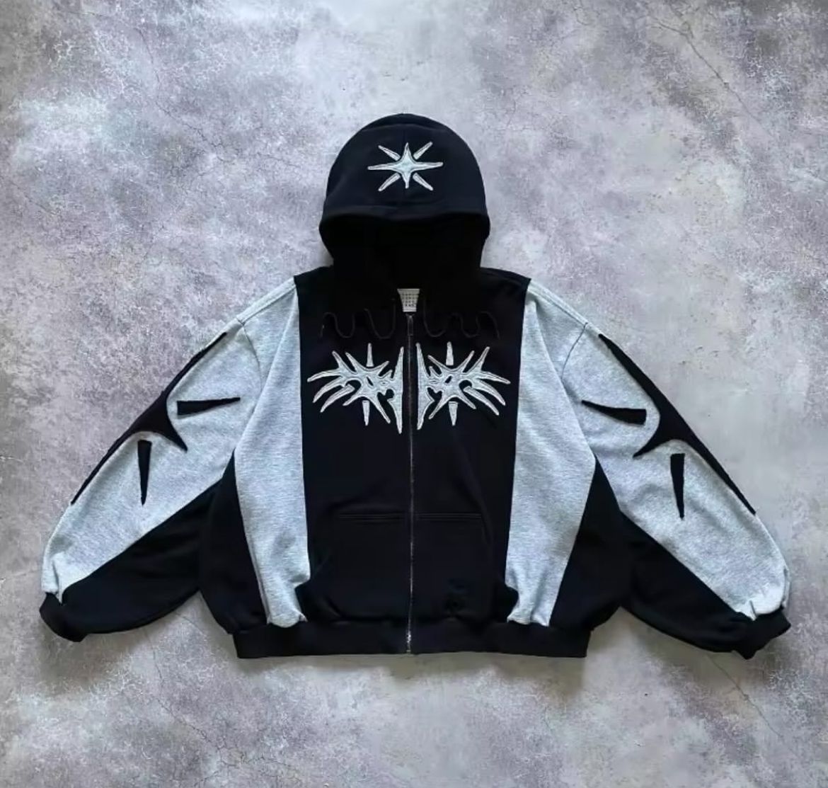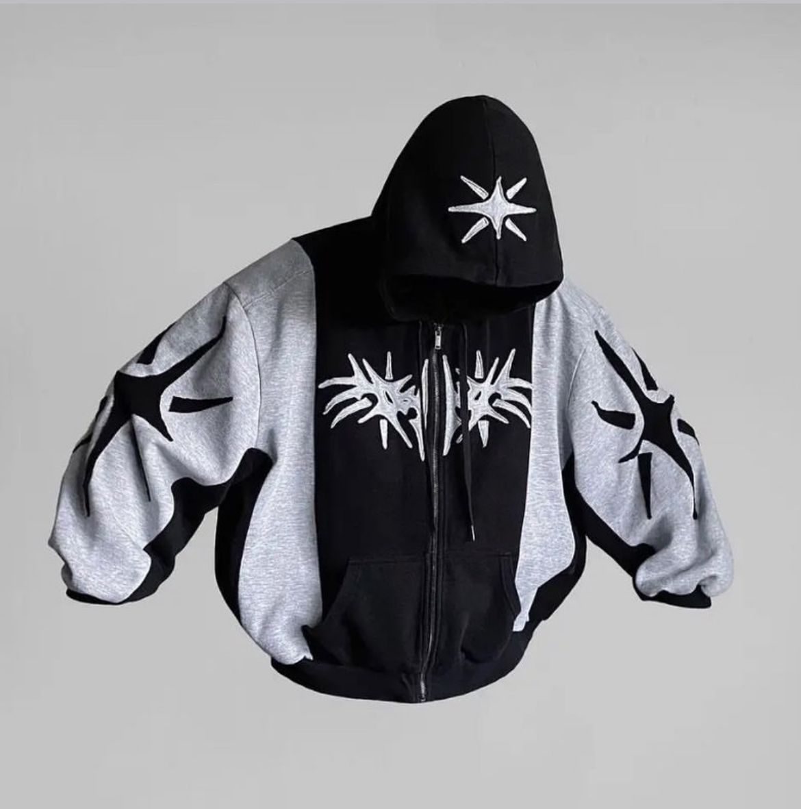 Elevate your style with this oversized zip-up hoodie, featuring intricate embroidery stitched on the chest and sleeves. Crafted from a premium cotton-polyester blend, this hoodie combines comfort with statement design. The detailed embroidery adds a bold, artistic edge to the minimalist base, making it a standout piece for any wardrobe. The zip-up design offers versatility and ease, perfect for layering or wearing solo. Whether you’re hitting the streets or chilling indoors, this hoodie is a modern essential for effortless streetwear vibes.
